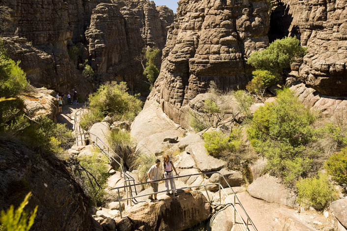 Awakening to birdsong and glorious sunshine, you'll set off on a tour of the stunning Grampians National Park, where you'll be able to see birds, kangaroos, wallabies, koalas, emus and even echidnas in their natural habitats. Traversing through gorgeous eucalypt forest surroundings past waterfalls and impressive sandstone ridges, you'll visit Boroka and Reid's Lookout or Lake Bellfield to take in the majestic surrounds. You'll also see the largest waterfall in the Grampians, McKenzie Falls. Then, its over to the ominous sounding "Jaws of Death" sandstone balconies, as well as to Hollow Mountain or Chautauqua Peak to experience the never-ending scenery.