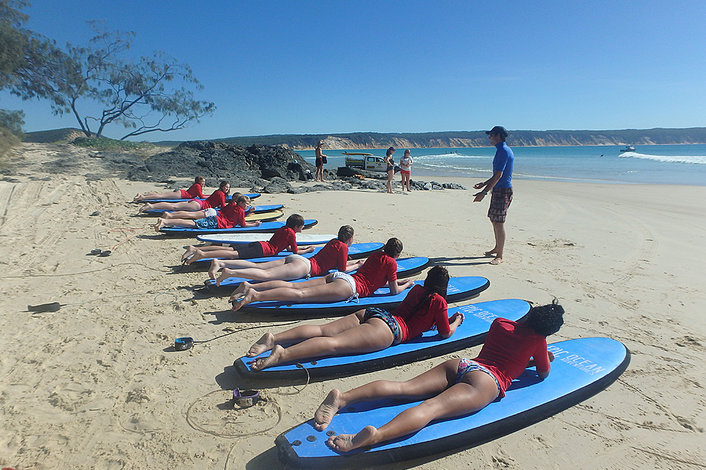 Learn to surf Rainbow Beach in waist deep water with friendly instructors that are highly experienced and fully qualified to get you surfing and having fun in a safe, uncrowded environment. We guarantee that you will stand up on your first learn to surf lesson!